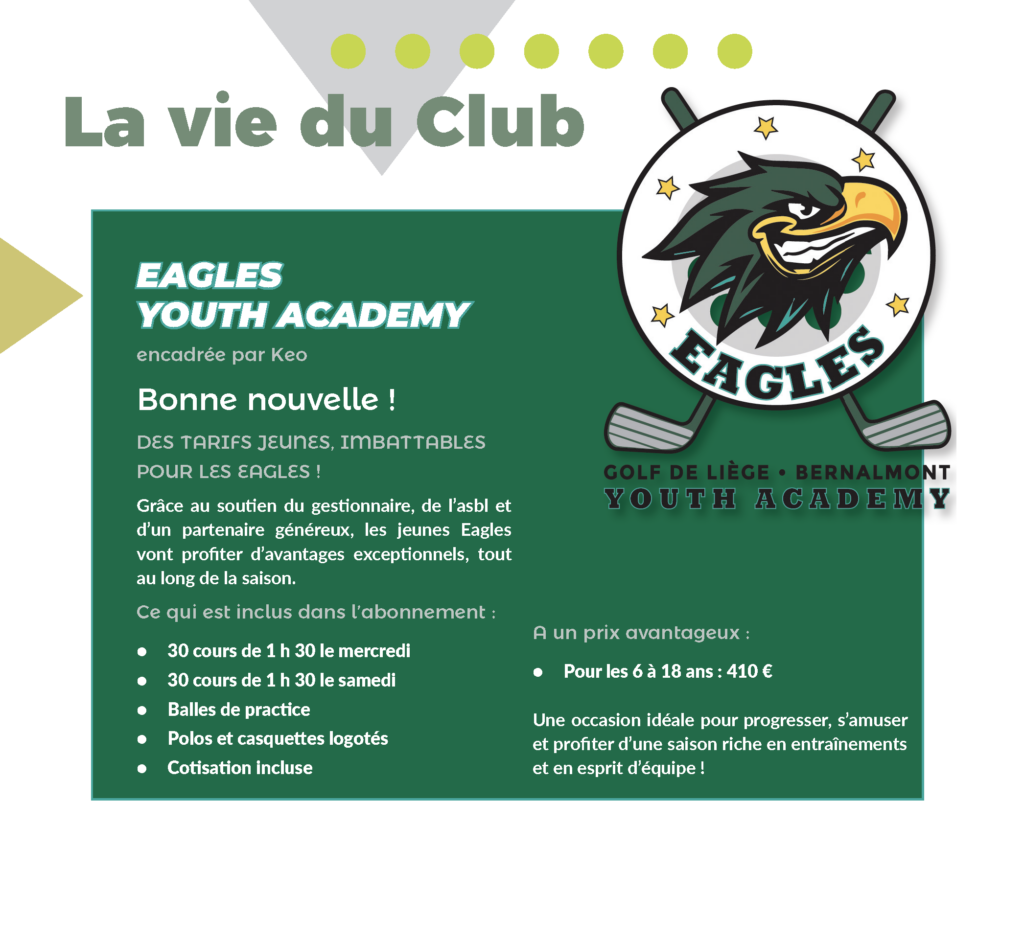 Post author:ASBL GOLF CLUB DE LIEGE BERNALMONT Post published:janvier 10, 2026 Post category:Eagles Academy Post comments:0 Comments DES TARIFS JEUNES, IMBATTABLES POUR LES EAGLES ! Author: ASBL GOLF CLUB DE LIEGE BERNALMONT You Might Also Like Eagles Academy décembre 1, 2025 Laisser un commentaire Annuler la réponse.You must be logged in to post a comment.